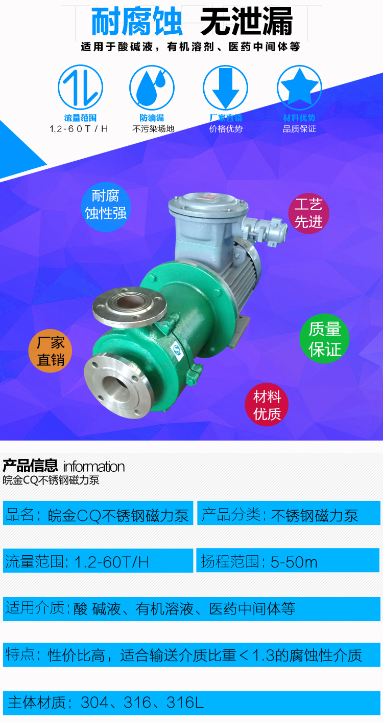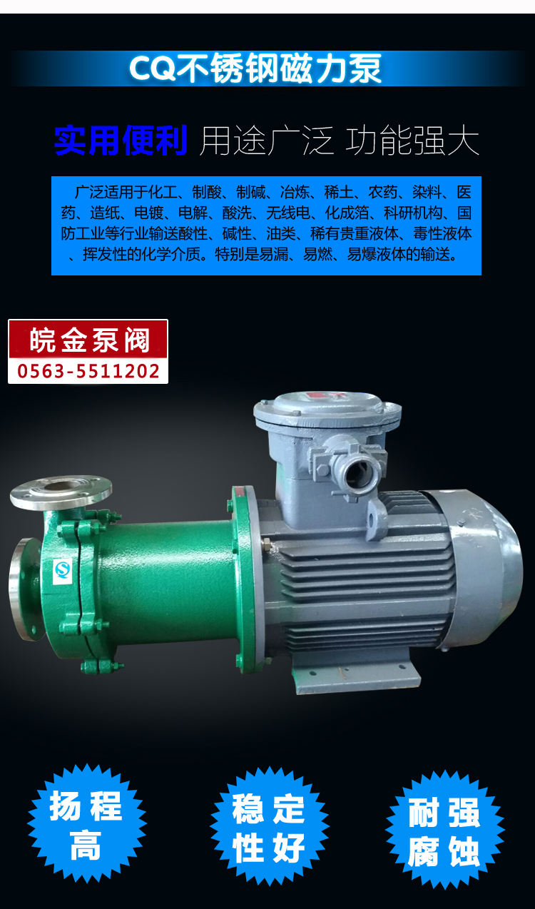 CQ耐腐蚀不钢磁力泵适用于石油、化工、冶炼、电镀、环保、食品、影视洗印、水处理等行业。