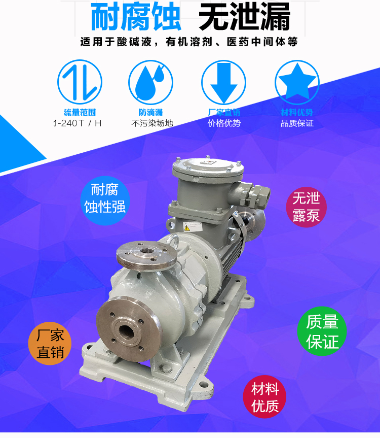 CQB不锈钢磁力泵过流部件采用全不锈钢材料(304、316、316L),内、外磁转子选用高磁能积、高矫顽力的稀土永磁制造,具有高效节能、介质适用面广、耐高温、磁性强、不退磁等优点,对有机酸,有机化合物,碱,中性溶液和各种气体都有良好的耐蚀性,双螺旋糟碳石墨轴承和硬质合金轴套,具有较强的耐磨性,是应用磁力耦合实现无接触传动、无动密封的新型高品质磁力化工泵。保证了产品的寿命,是无泄漏输送腐蚀性介质的用泵。