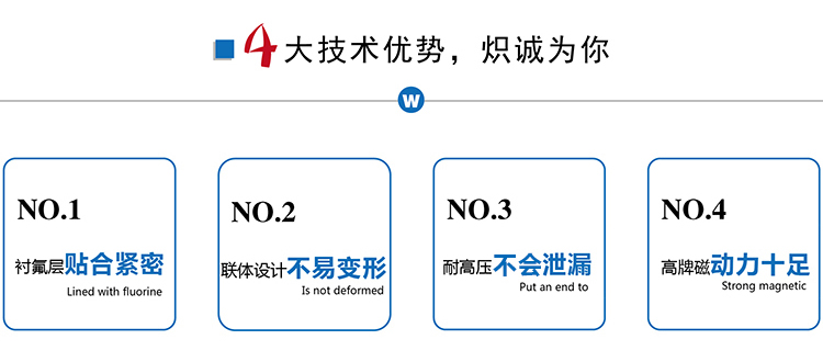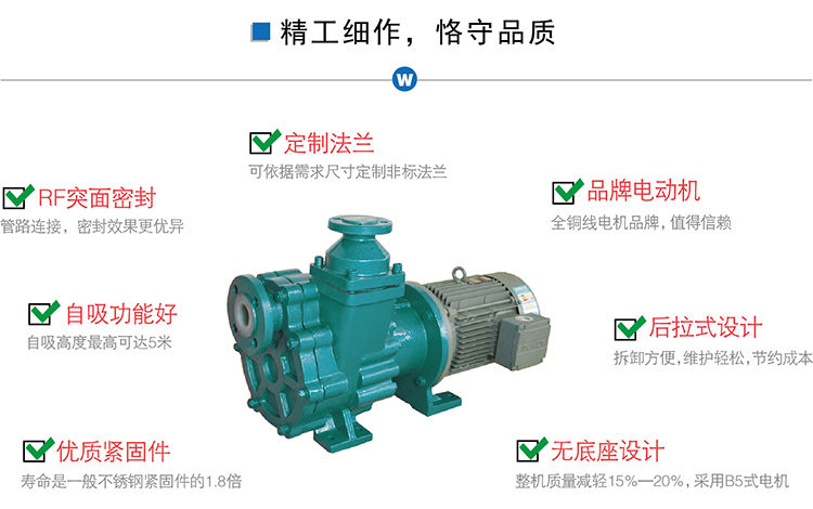 氟塑料磁力泵又称其为氟塑料磁力离心泵、衬四氟磁力泵、氟塑料磁力驱动泵、耐腐蚀磁力化工泵,CQB-FJ衬氟磁力泵是我公司氟塑料磁力泵中的全新升级款型。氟塑料磁力泵另有:CQB-
